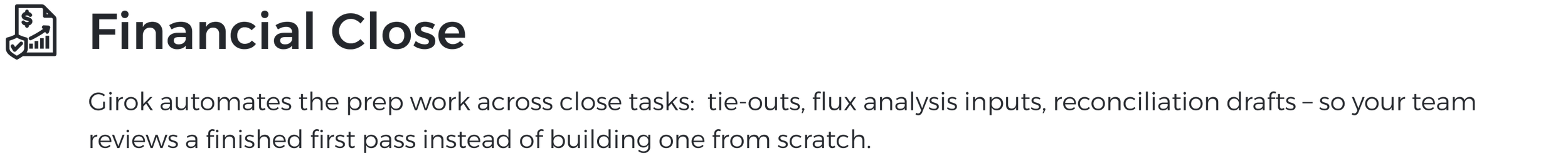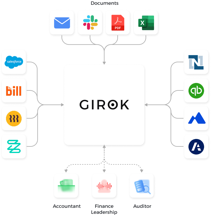 Girok is your AI agent that performs the first-level pass of all your transactions and documents across your existing applications — so your team focuses on review and judgment, not manual prep.